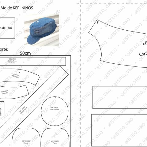 Este molde está diseñado para confeccionar una gorra estilo kepi para niño de aproximadamente 1 año. La medida base es de 47 cm de circunferencia, tomada con el abrojo colocado de forma pareja, pudiendo aflojarse o ajustarse.